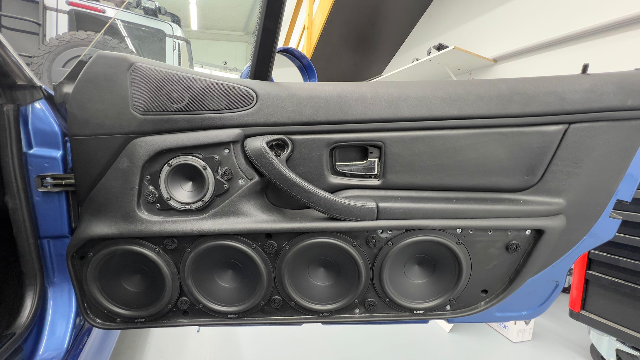 Für die perfekte Klangbasis kamen hochwertige Audison Lautsprecher zum Einsatz. Diese wurden mit neuen Doorboards verbaut und mit einer professionellen Türdämmung kombiniert. Dadurch werden störende Vibrationen reduziert und der Schalldruck im Innenraum deutlich verbessert.